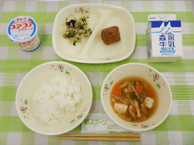29  きょうの みそにには、にんじん・だいこん・ごぼう・さといもといった たくさんの こんさいが はいっています。とりにくと いっしょに あかみそで にこんでいます。 |