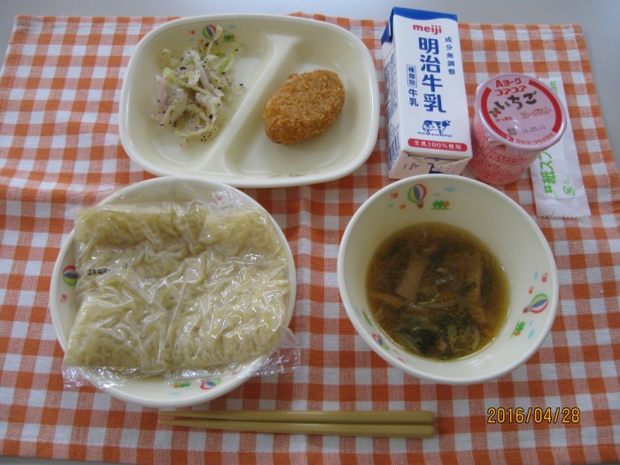 献立カレンダープレビュー 2016年04月28日 ラーメン ぎゅうにゅう ごもくラーメン コーンフライ ゆかりあえ いちごヨーグルト ゆかりあえには、あいちけんでとれた あかしそを ふんまつにした ゆかりこが つかわれています。