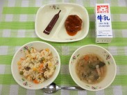 献立カレンダープレビュー 2022年10月18日 むぎごはん ぎゅうにゅう コンソメスープ ハンバーグのブラウンソースかけ えびピラフのぐ ココアぎゅうにゅうのもと ブラウンソースは、とかしたバターに こむぎこを いれ、こげちゃいろに なるまで いためます。そこに スープをくわえて のばします。さんみと こくが ある ソースです。
