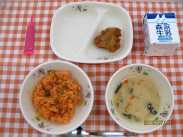 献立カレンダープレビュー 2018年07月13日 ごはん ぎゅうにゅう チキンライスのぐ あじのフリッター クリームスープ いちごぎゅうにゅうのもと チキンライスは、にほんはっしょうの ようしょくといわれています。ごはんに チキンライスのぐを まぜてたべましょう。