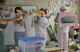 「あんきゅー」は給食を運ぶトラックにも描かれていることをパネルで紹介しました。最後に大きな「あんきゅー」が登場して、たくさん食べて「あんきゅー」みたいに、大きくなってね!と伝えました。講座後に、「あんきゅー」を抱きしめに来る園児がたくさんいました。