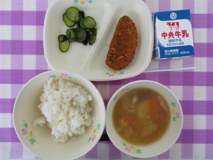 献立カレンダープレビュー 2022年06月15日 ごはん ぎゅうにゅう あじアーモンドフライ けんちんじる きゅうりとわかめのすのもの 給食のごはんは、「あいちのかおり」という種類のお米で、安城市産です。名前の通り香りがよく、甘みがあります。また、冷めてもおいしく食べられるのが特徴です。地元のお米をよくかんで味わって食べましょう。