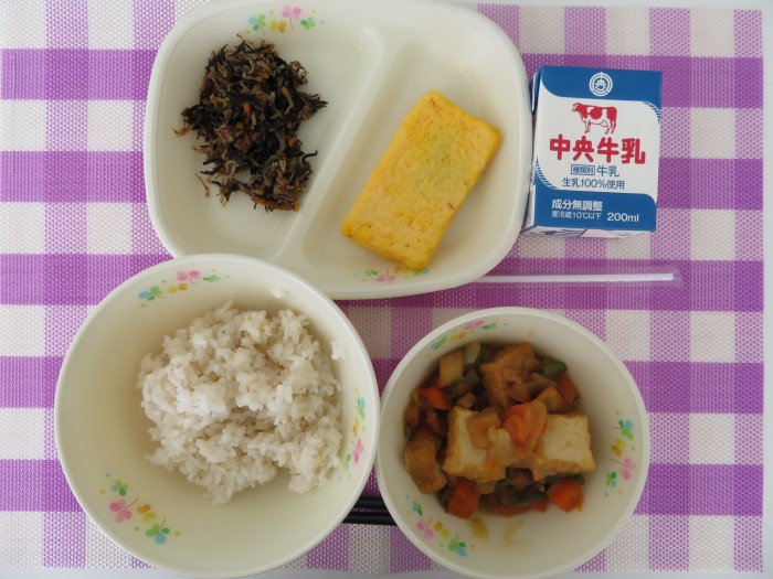献立カレンダープレビュー 2022年11月08日 むぎごはん ぎゅうにゅう ほうれんそういりたまごやき いかとやさいのうまに ひじきとじゃこのふりかけ いかは、種類が多くありますが、給食ではむらさきいかを使っています。火を通しても硬くならず、加工食品に多く使用されています。10本の足の内2本の長い足でエサを採り、敵に会うとすみを出して逃げます。
