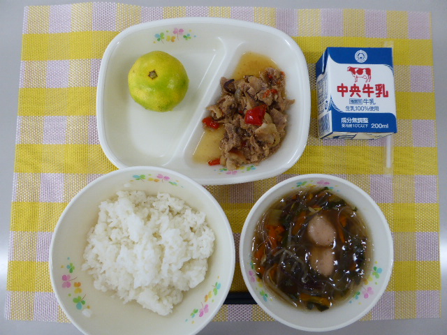 献立カレンダープレビュー 2023年10月04日 ごはん ぎゅうにゅう プルコギ いかだんごのスープ みかん プルコギは、甘辛いたれに漬け込んだ肉を野菜と一緒に炒めて作る、韓国料理です。韓国語で「プル」は火を、「コギ」は肉を意味します。