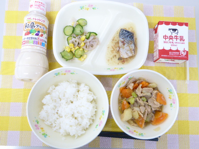 献立カレンダープレビュー 2026年04月17日 ごはん ぎゅうにゅう さばのおかかに ぶたにくとやさいのしょうがに みかわみどりとれんこんのわふうサラダ たくじょうわふうクリーミードレッシング ☆よいきゅうりの日(西三河冬春きゅうり部会からの寄贈です)☆