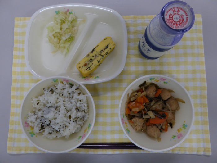 献立カレンダープレビュー 2017年09月12日 わかめごはん ぎゅうにゅう あいちのごもくあつやきたまご ちゃんこに キャベツのたくあんあえ あいちのごもくつやきたまごには あいちけんでとれたれんこん、にんじん、こまつな、しいたけ、あおじそがはいってます。