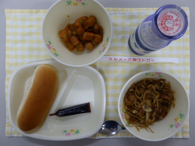 献立カレンダープレビュー 2019年04月24日 こがたロールパン ぎゅうにゅう やさいたっぷりやきそば ソーセージのケチャップに コーヒーぎゅうにゅうのもと やきそばやラーメンにつかわれる ちゅうかめんは こむぎこにかんすいというアルカリせいのみずをくわえて こねてつくります。