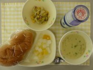 献立カレンダープレビュー 2020年09月09日 クロスロールパン ぎゅうにゅう えだまめのクリームスープ やさいソテー ナタデココゼリーミックス 枝豆は、成長する前の青い大豆です。大豆に比べてビタミンAやビタミンⅭが、たくさん含まれています。